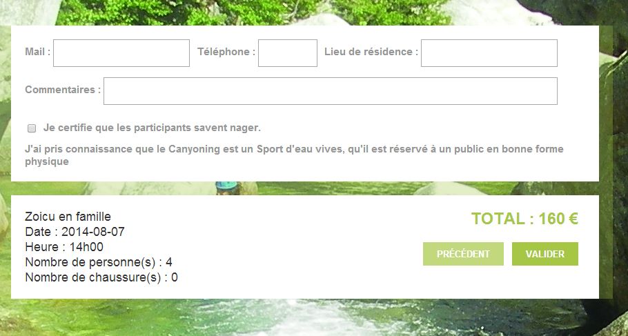 Il ne reste plus qu'a payer en Carte bancaire ( service paypal) pour recevoir la confirmation, l'heure de rendez vous et se préparer a découvrir en famille un nouveau canyon en Corse !