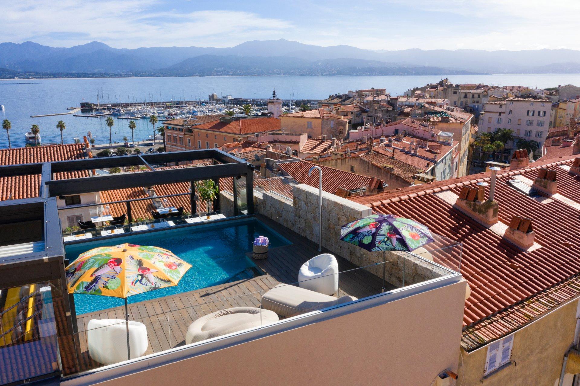 Grande nouveauté pour un hôtel du centre ville d'Ajaccio, la piscine chauffée est située en extérieur, sur le toit. Mais elle ne fait pas partie du très bel espace bien-être qui se trouve dès l'entrée de l'hôtel, au premier niveau.